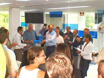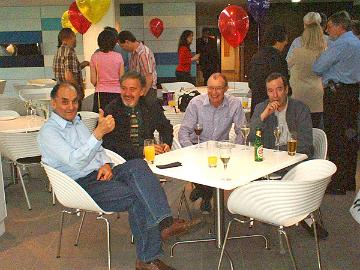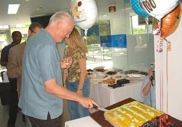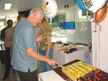 Graham Smith's Retirement Party on the 5th of August 2005: Graham trying to cut the cake after a few glasses of wine.Graham Smith's Retirement Party on the 5th of August 2005: Graham Smith being presented by, Mischa Vukcevic, with gifts with Penny Lent looking on.Graham Smith's Retirement Party on the 5th of August 2005: Left to right: Mischa Vukcevic, Harry Llufrio (me), Robin Hindle and Stuart Sharpe. (STAR)
