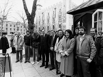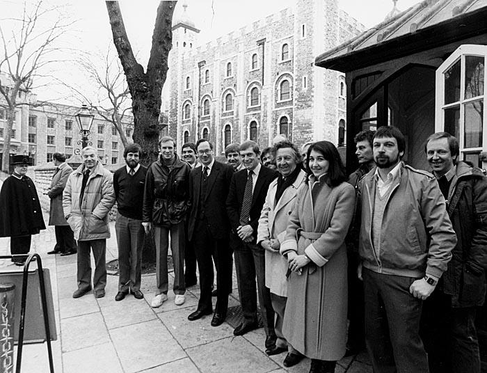Tower of Londfon 1984 - Program Unknown - Left to Right: Wally King (Sound), Mike Ayres (Sound), ???, Jeremy Canney (Locations), Duke Of Gloucester, John…